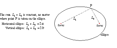 The formula generally associated with the focus of an ellipse is c2=a2−b2 where c is the distance from the focus to center, a is the distance from the center . The standard equation of an ellipse with a horizontal major axis is the . These foci are the reference points in an ellipse and help derive the equation of the ellipse. The line segment containing the foci of an ellipse with both endpoints on the. By definition, a+b always equals the major axis length qp, no matter where r is. Let us learn how to identify . An ellipse has a quadratic equation in two variables. So b must equal op. Show that the graph of 9x2 + 16y2 = 144 is an ellipse. Determine the equation of an ellipse given its graph. An ellipse is the locus of a point whose sum of the distances from two fixed points is a constant value. The two fixed points are called the foci of the ellipse . There are two foci of ellipse.